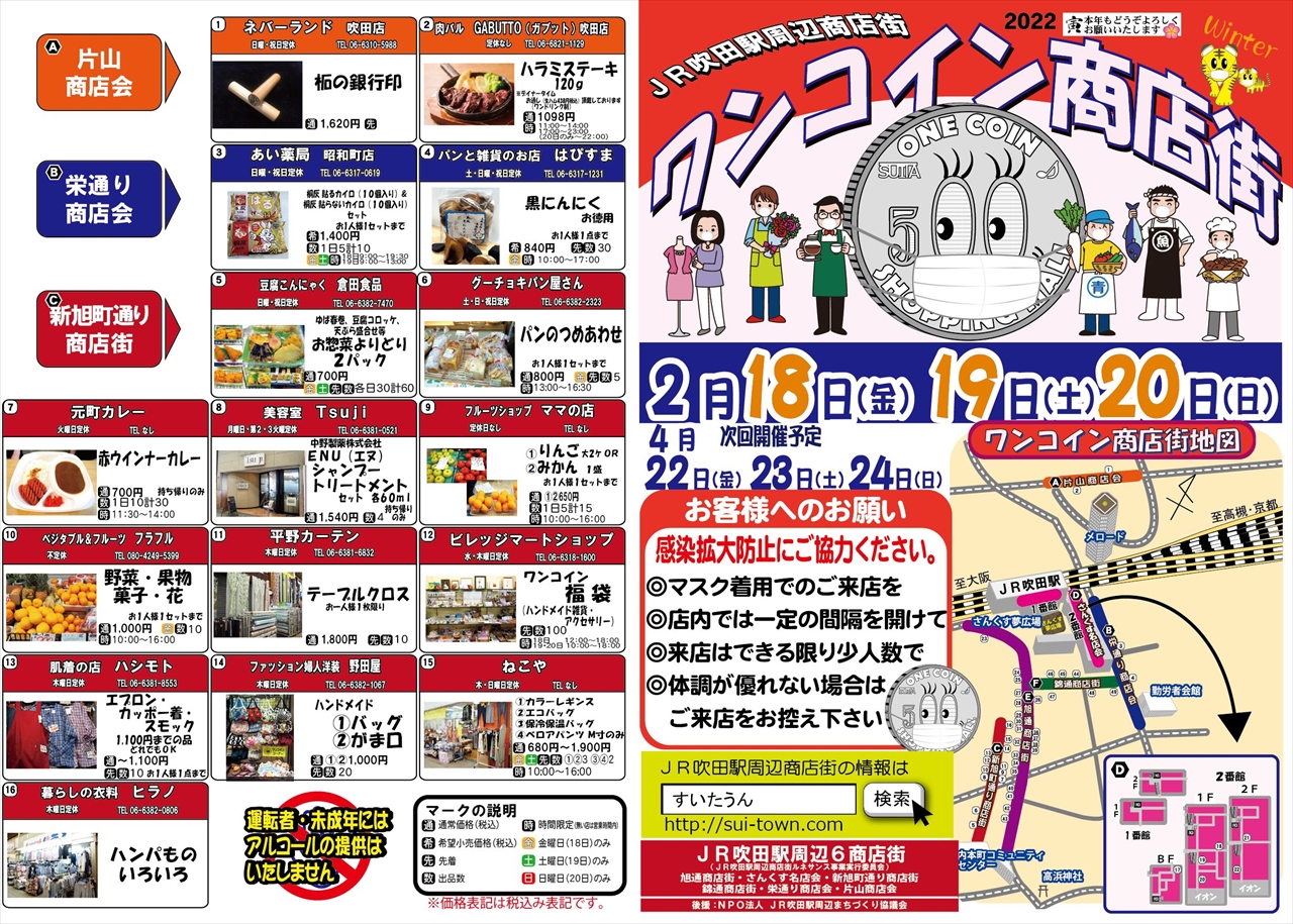 2022年2月18日(金)19日(土)20日(日)ワンコイン商店街を開催します! 各店舗ともしっかりとコロナ対策を行っておりますので、安心して商店街でお買い物ください。 【コロナ感染症拡大防止にご協力ください】 ■マスク着用でのご来店をお願いします。 ■店内では一定の間隔を開けてお買い物をお願いします。 ■来店はできる限り少人数でお願いします。 ■体調が優れない場合はご来店をお控えください。