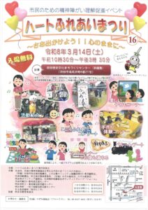 市民のための精神障がいの理解促進イベント「ハートふれあいまつり」が開催されます。 3月14日(土)10:30〜15:30吹田歴史文化まちづくりセンター浜屋敷 (吹田市南高浜町6-21)入場無料