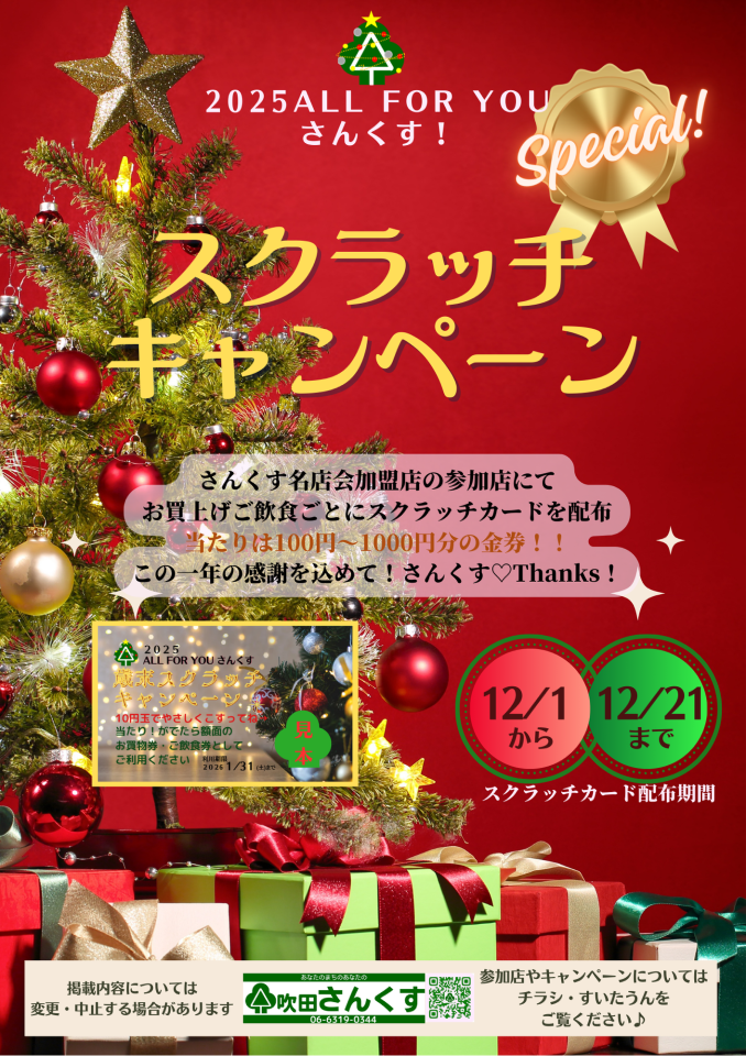 さんくす名店会では、2025年12月1日(月)から12月21日(日)まで 2025 ALL FOR YOUさんくす! スクラッチキャンペーンを開催します。